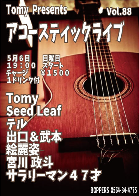 Tomy Presents アコースティックライブ 88 5月6日 日曜日 19:00 スタート チャージ¥1500 1ドリンク付き Tomy Seed Leaf テル 出口&武本 絵麗姿 宮川政斗 サラリーマン47才