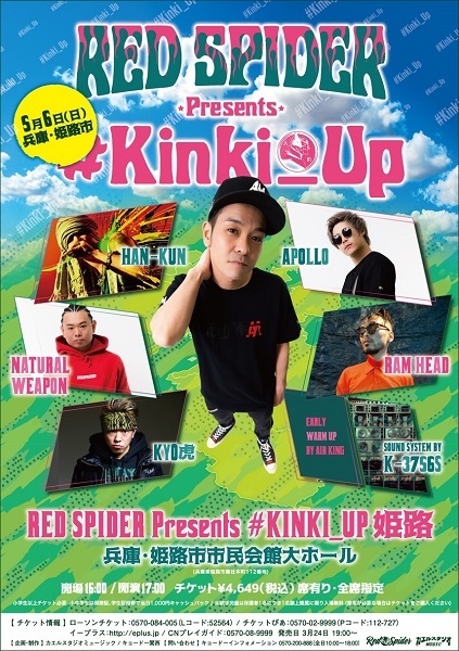 開場:16:00 開演:17:00 会場:姫路市民会館 場所:兵庫県 住所:兵庫県姫路市総社本町112 チケット:発売中 お問い合わせ:キョードーインフォメーション 電話:0570-200-888 (全日 10:00〜18:00) RED SPIDER APOLLO NATURAL WEAPON HAN-KUN RAM HEAD KYO虎 前売チケット \4,649(税込) ※全公演共通 ■TICKET INFO ローソンチケット 0570-084-005(Lコード:52564) http://l-tike.com/search/?keyword=52564 チケットぴあ 0570-02-9999(Pコード:112-727) http://ticket-search.pia.jp/pia/search_all.do?kw=112-727 イー
