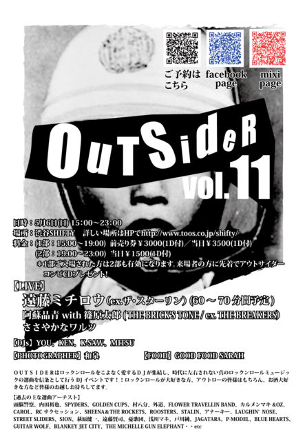 ¡ÚOUTSIDER Vol.11¡Û ¡ÚÆü»þ¡Û¡§5·î6Æü(Æü)15¡§00¡Á23¡§00 ¡Ú²ñ¾ì¡Û¡§½ÂëSHIFTY ¾Ü¤·¤¤¾ì½ê¤ÏHP¤Çhttp://www.barshifty.tokyo/ ¡ÚÎÁ¶â¡Û (1Éô(LIVE&DJ)):15:00¡Á19:00 ÅöÆü·ô(17¡§30ÈÎÇäͽÄê)¡ï3500(1DÉÕ) (2Éô(DJ):19:00¡Á23:00) ÅöÆü¡ï1500(1DÉÕ) ¡ö1Éô¤´Æþ¾ì¤µ¤ì¤¿Êý¤Ï2Éô¤â͸ú¤Ë¤Ê¤ê¤Þ¤¹¡£2Éô¤è¤êºÆÆþ¾ì¤Ç¤¤Þ¤¹¡£Íè¾ì¼Ô¤ÎÊý¤ËÀèÃå¤Ç¥¢¥¦¥È¥µ¥¤¥À¡¼¥³¥ó¥ÔCD¥×¥ì¥¼¥ó¥È¡ª ¡ÚLIVE¡Û Ž¥±óÆ£¥ß¥Á¥í¥¦¡Êex.¥¶¡¦¥¹¥¿¡¼¥ê¥ó¡Ë (¡öÌó60¡Á70ʬ±éÁÕͽÄê) Ž¥°¤ÁÉÉÊÀÄwith¼Ä¸¶ÂÀϺ(THE BRICK'S TONE¡¿ex¡¥THE BREAKERS)
