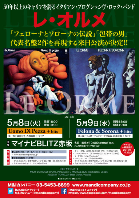 50年以上のキャリアを誇る 50年以上のキャリアを誇る イタリアン・プログレッシヴ・ロック・バンド 『LE ORME <レ・オルメ>』 「フェローナとソローナの伝説」「包帯の男」 代表名盤2作を再現する来日公演が決定!! -------------------------- 【LE ORME Japan Tour 2018】 5月8日(火)「Uomo Di Pezza」+ hits 第一夜:「包帯の男」再現公演 + ヒッツ 5月9日(水)「Felona & Sorona」+ hits 第二夜:「フェローナとソローナの伝説」再現公演 + ヒッツ 会 場:マイナビBLITZ赤坂 時 間:開場18:00/開演19:00 料