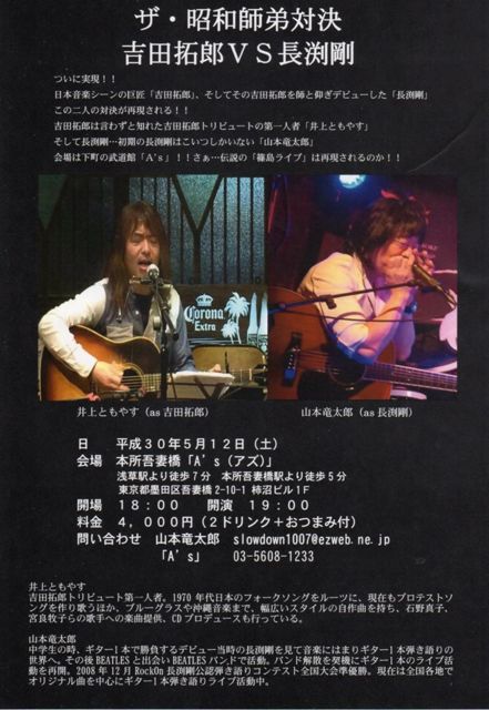 A'sコミュニティのみなさま、こんばんは! 管理人のマーティンです。 本日は素晴らしいLIVEのご案内です! あの方とのジョイントライブがいよいよ実現します!! 「ザ・昭和師弟対決 吉田拓郎vs長渕剛」!! ◆日時 平成30年5月12日(土) ◆時間 開場18:00 開演19:00 ◆会場 本所吾妻橋「A's」 ◆料金 4,000円(2ドリンク+おつまみ付) 吉田拓郎担当は言わずと知れた井上ともやすさん!! http://www2.ttcn.ne.jp/~tomoyasuinoue/index.htm 長渕剛は山本竜太郎さんが担当します! 一対一のガチンコ対決!! きっと皆さまの心