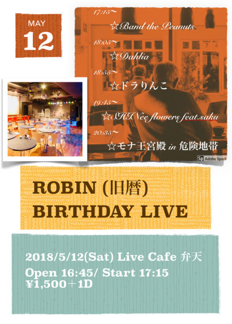 【日時】2018/5/12(土) 【会場】Live Cafe弁天 http://www.benten55.com/top.htm 【出演バンド】 ☆Band the Peanuts〈Popsカバー〉 [Vo:Chiro ,Vo:Robin ,Gt:MIYOSHI ,Ba:きっしー ,Kb:タカギ ,Dr&Vo:かず,Per.ちいたろう] ☆ドラりんこ 〈ドラえもんの楽曲を中心に藤子・F・不二雄のアニメの楽曲カバー〉 [Vo:R♪nco ,Gt:Ino :K:みき ,Ba/Ds:つっちー ,Ba/Ds:きぃ〜ぼ〜 ] ☆Dahlia 〈邦楽ロックカバー〉 [Vo.:緋色 ,Gt. カズ ,Ba. もこやま ,Dr. neo ] ☆SHINee flowers feat.saku〈歌謡曲カバー〉 [Vo:sa