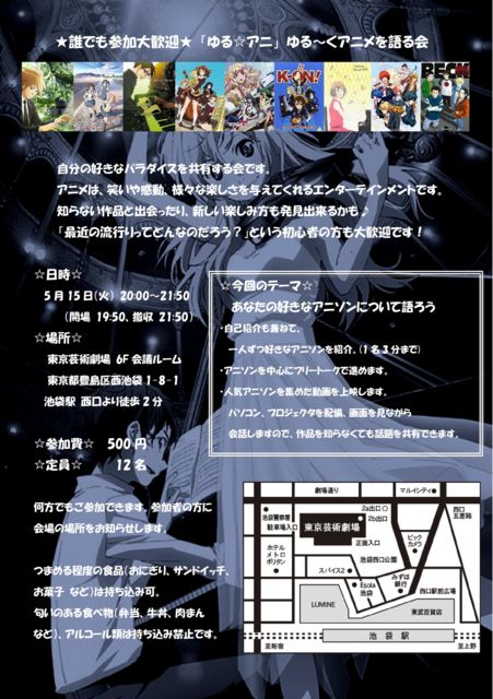 管理者様 スペースをお借りします。 「ゆる☆アニ」は、アニメやマンガをゆる〜く語り合い、自分の好きなパラダイスを共有する会です。 アニメは、笑いや感動、様々な楽しさを与えてくれるエンターテインメントです。 知らない作品と出会ったり、新しい楽しみ方も発見出来るかも♪ 「最近の流行りってどんなのだろう?」という初心者の方も大歓迎です! 日時:5月15日(火)20:00〜21:50 (開場 19:50 撤収 21:50) 場所:東京芸術劇場 6F 会議ルーム 東京都 豊島区西池袋1-8-1 池袋駅 西口より徒歩2分 参
