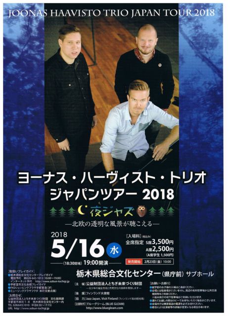 ■ヨーナス・ハーヴィスト・トリオ ジャパン・ツアー 2018■ 〜北欧の透明な風景が聴こえる〜 フィンランドで今注目される気鋭のピアニスト、ヨーナス・ハーヴィスト(トリオ)に よる4度目の来日公演が実現! 北欧の美しい旋律と和声、現代的なアレンジ で表現するコンテンポラリージャズの空間創造と美学! <JOONAS HAAVISTO TRIO JAPAN TOUR 2018> ■5月16日(水) 栃木県総合文化センター サブホール (栃木) 開場18:30 開演19:00 [全席指定] S席3,500円 A席2,500円 TEL 028-643-1010 (同センター) http://www.sobun-tochig