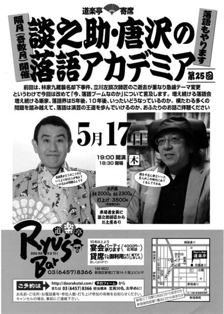 『談之助・唐沢の落語アカデミア』vol25 今回のテーマ「今、本当に落語ブームか?」 日時:5月17日(木)午後6時半開場 7時開演 出演:立川談之助 唐沢俊一 ゲスト立川吉幸 会場:道楽亭Ryu'sBar http://www.ryus-dourakutei.com/pctop.html 料金:当日2,300円 予約:2,000円(予約03-6457-8366道楽亭) ※3,000円で食べ飲み放題の打ち上げあり dan@mri.biglobe.ne.jp でも予約可