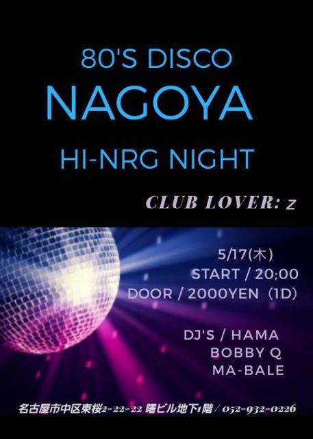 80's DISCO 名古屋ハイエナジーNIGHT 5/17(木) START 20;00 DOOR 2000yen (1D) DJ's / HAMA Bobby Q Ma-Bale ハイエナジーが多め。 今月は、DJ Ma-baleがラバーズ初登場! いつものROCK,POPS,etcに加えてSOULも少々交えながらの名古屋ディスコサウンドをお楽しみくださいませ。 場所: CLUB LOVER:z 住所: 名古屋市中区東桜2-22-22 曙ビル地下1階 電話: 052-932-0226 *東横INN名古屋栄となり 地図 https://goo.gl/maps/8TXgt3uTxAL2 ★予告★★★★ ★5/31(木) 80s ラウンジ @ SNUND B