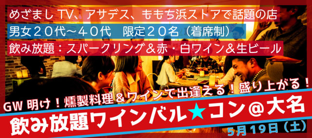 テレビ番組で話題となっているワインビストロで ワインを飲もう!出逢おう! ワインが好き・もっとワインに詳しくなってみたい。 ワイン好きな人と仲良くなって、飲みに行きたい。 ワイン好きにぴったりな 『ワインバル★コン@福岡 大名』が 5月19日(土)に開催されます! 今回は 『GW明け!燻製料理&ワインで出逢える、盛り上がる!』 ◆ 男女20代〜40代までOK(独身限定)◆ ◆ 男女比率 同数 ◆ ◆ 女性1名:3,500円 ◆ ◆ 男性1名:4,500円 ◆ 上記と別にお得な金額を設定いたしました! ◆ 女性2名:3,300円/1名 ◆ ◆ 女性