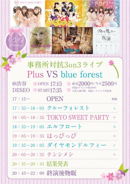 »ö̳½êÂй³3on3¥é¥¤¥Ö¡ÖPlus VS blue forest¡× Æü»þ¡§05/19(ÅÚ) ³«¾ì18:00 / ³«±é18:30 ²ñ¾ì¡§½ÂëDESEO ÎÁ¶â¡§Á°Çä2,000±ß / ÅöÆü2,500±ß¡Ê1DÊÌ600±ß¡Ë¢¨ºÆÆþ¾ì²Ä(Í×1D) ½Ð±é¡§¤Ï¤Ã¤Ô¤Ã¤Ô/¥Æ¥ó¥·¥á¥·/TOKYO SWEET PARTY ¥¨¥ë¥Õ¥í¡¼¥È/¥À¥¤¥ä¥â¥ó¥É¥ë¥Õ¥£¡¼/¥¯¥ë¡¼¥Õ¥©¥ì¥¹¥È