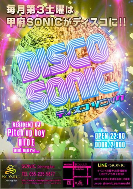 Ëè·îÂè3ÅÚÍË¤Ï ¹ÃÉÜ SONIC¤¬¥Ç¥£¥¹¥³¤Ë¡ª¡ª ¼ã¤¤À¤Â夫¤é¥·¥Ë¥¢À¤ÂåËø¡¢³§¤Ç³Ú¤·¤á¤ë¥¤¥Ù¥ó¥È ¤½¤ì¤¬¡ÖDISCO SONIC ¡× 2018.5.19(Sat) DISCO SONIC OPEN 22:00 DOOR 2,000 SPECIAL GUEST DJ POPPY / TURBO RESIDENT DJ Pitch up boy / HIDE º£·î¤«¤é¡¢DISCO SONIC ¤¬¥ê¥Ë¥å¡¼¥¢¥ë¡ª¡ª🎵 Ëè·îguestDJ ¤ò¤ª¾·¤¤·¥´¡¼¥¸¥ã¥¹¤Ë¤ªÁ÷¤êÃפ·¤Þ¤¹¡£ Æþ¾ì¥¨¥ó¥È¥é¥ó¥¹ÎÁ¶â¤Ï2,000 ±ß¤Ç³Ú¤·¤á¤Þ¤¹¡ª ³§ÍͤªÂÔ¤Á¤·¤Æ¤ª¤ê¤Þ¤¹¡ª¡ª Dinning Bar SONIC ¸ø¼° LINE ID @sonic.yamanashi »³Íü¸©¹ÃÉÜ»ÔÃæ±û1-15-9 O-LAND BLDG 3F 055-225-5877 http