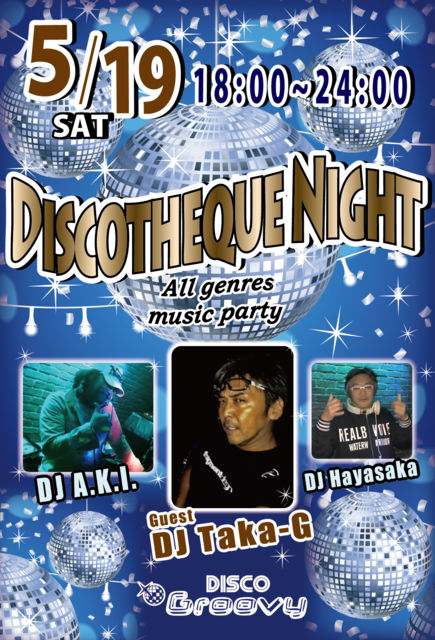 DISCO Groovy 5·î¤âÂè3ÅÚÍËÆü¤Ï¡ª ¡ÚDJ A.K.I.¡Û¤Ë¤è¤ë¡ÔDiscotheque Night Special¡ÕDISCO DJ¤Ê¤é¤Ç¤Ï¤ÎÀä̯¤Ê¥È¡¼¥¯¡õDJ¥×¥ì¥¤¤Ë¤Æ²£ÉͤΥµ¥¿¥Ç¡¼¥Ê¥¤¥È¤òÀ¹¤ê¾å¤²¤Þ¤¹¡ª º£²ó¤Ï¥¹¥Ú¥·¥ã¥ë¥²¥¹¥È¤È¤·¤Æ¡ÚDJ TAKA-G¡Û¤¬Åо줷¹¹¤ËÇ®¤¯ÍÙ¤ì¤ë°ìÌë¤ò±é½Ð¤·¤Þ¤¹¡ù ¡Ú²»³Ú¡Û¥ª¡¼¥ë¥¸¥ã¥ó¥ë Soul¡¢Funk¡¢Dance Classics¡¢Hip-Hop¡¢R¡õB¡¢EDM¡¢Eurobeat¡¢etc... ¡Ú³«ºÅ»þ´Ö¡Û 18¡§00¡Á24¡§00 ¡Ú¥Ï¥Ã¥Ô¡¼¥¢¥ï¡¼ÎÁ¶â / 18:00¡Á19:00¤Ë¤´ÍèŹ¤ÎÊý¡Û ¡üÃËÀ¡§¡ï2,500 / 2Drinks¡¡¡ü½÷À¡§¡ï2,000 / 2Drinks ¡ÚÎÁ¶â / 19:00°Ê¹ß¤´ÍèŹ¤ÎÊý¡Û ¡ü