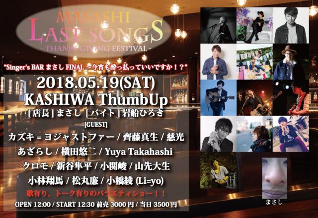 ¢¨¥«¥º¥¡¡Ìó£²Ç¯¤Ö¤ê¤Ë¥½¥í¤Ç¤Î¥é¥¤¥Ö¤òºÆ³« "Singer's BAR ¤Þ¤µ¤·FINAL¡Áº£¾¬¤â¿ì¤Ãʧ¤Ã¤Æ¤¤¤¤¤Ç¤¹¤«¡ª¡©" MASASHI LAST SONGS Vol.16¡Á [ŹĹ]¤Þ¤µ¤· [¥Ð¥¤¥È]´äÁ¥¤Ò¤í¤ [GUEST]¥«¥º¥=¥è¥¸¥ã¥¹¥È¥Õ¥¡¡¼/óîÆ£¿¿À¸/»ü¸÷/¤¢¤¶¤é¤·/²£ÅÄͪÆó /Yuya Takahashi/¥¯¥í¥â/¿·Ã«È»Ê¿/¾®´Ø½Ô/»³ÀèÂçÀ¸/¾®ÎÓæÆÇÏ/¾®¶¶°½(Li=yo) OPEN 12:00/START 12:30 Á°3000±ß/Åö3500±ß(DÂåÊÌ600±ß) ¥«¥º¥¡á¥è¥¸¥ã¥¹¥È¥Õ¥¡¡¼¡¡¢Í19»þ¡Á19»þ30ʬ ¡Ê²¼µ¥¿¥¤¥à¥Æ¡¼¥Ö¥ë»²¾È¡Ë ͽÌó¡¡¢Íkazuyojya@gmail.com¤Þ¤Ç¡ª ÇðThumbUp¡¡http://www.kashiw