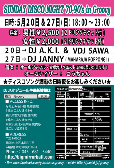 5月も第3&第4の日曜日に開催となります【SUNDAY DISCO NIGHT】日曜日にしかお出かけできない方々など、休日でもDISCOなNIGHTを存分にお楽しみいただけます(^_-)-☆♬ 【オーガナイザー】こうちゃん 【DJ A.K.I. & VDJ SAWA】 【音楽】オールジャンル (SOUL、竹の子、EURO、HI-NRG、R&B、etc... 皆様のリクエストにお応えします!) 【開催時間】18:00〜23:00 【料金】 男性:¥2,500 / 2Drinks 女性:¥2,000 / 2Drinks