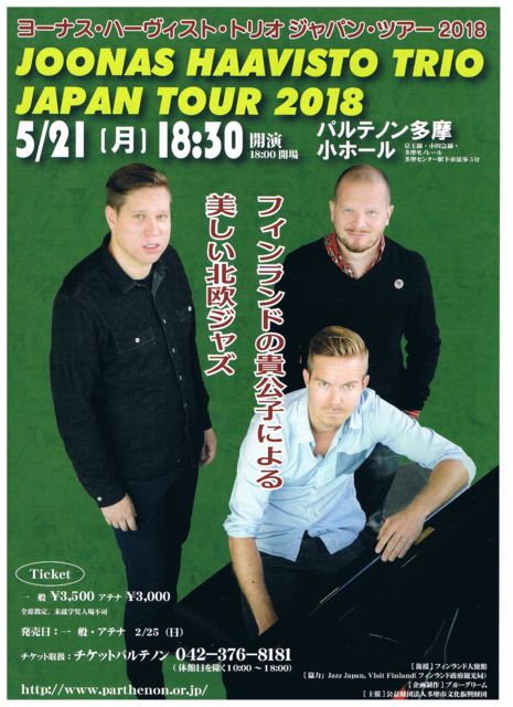 ■ヨーナス・ハーヴィスト・トリオ ジャパン・ツアー 2018■ 〜北欧の透明な風景が聴こえる〜 フィンランドで今注目される気鋭のピアニスト、ヨーナス・ハーヴィスト(トリオ)に よる4度目の来日公演が実現! 北欧の美しい旋律と和声、現代的なアレンジ で表現するコンテンポラリージャズの空間創造と美学! <JOONAS HAAVISTO TRIO JAPAN TOUR 2018> ■5月16日(水) 栃木県総合文化センター サブホール (栃木) 開場18:30 開演19:00 [全席指定] S席3,500円 A席2,500円 TEL 028-643-1010 (同センター) http://www.sobun-tochig