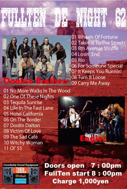 5/24 本日はFullTen de Night 62夜 【カリフォルニア対決】 The Doobie Brothers & The Eagles です! Doobieはアルバム「ドゥービーストリート」全曲。 Eagles は だで&あき による選曲です。 同じウェストコーストロックでも大きく違う2バンド。 フルテンで聞くとまた良さが広がります! 気軽にお立ち寄りください〜(^^) https://www.facebook.com/Fullten-de-night-295652277527005/ OPEN 19:00 START 20:00 CHARGE 1000円