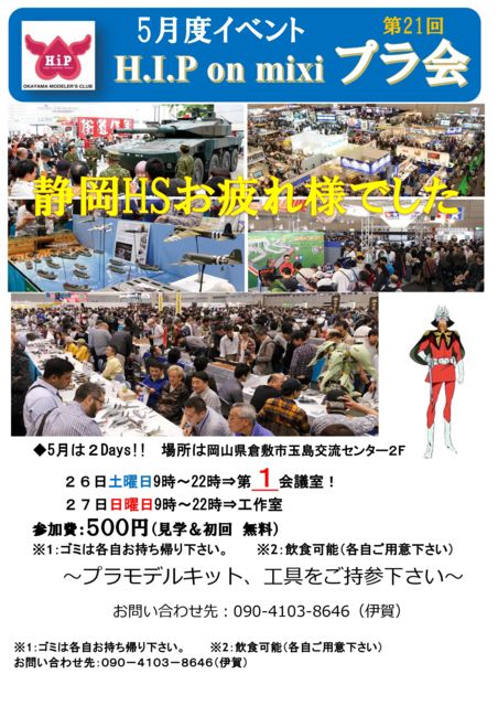 5月のプラ会のご案内! 5月後半、5・27日曜日のご連絡です! 今回は今月12日・13日に開催された静岡ホビーショーお疲れ会にできたらなーと思います。参加された方是非作品をお持ちください。 日時:平成30年5月27日(日曜日)9時〜22時(13H) いつ来て帰ってもOKです。定員20名迄となります。 場所:倉敷市玉島 「玉島交流センター」:2F 工作室 ◆5/26,5/27のうち2Day出関で2日目より各日200円引きで参加できます! ※以前は予約者だけでしたが辞めてどなたでも二日目は200円引きにしま