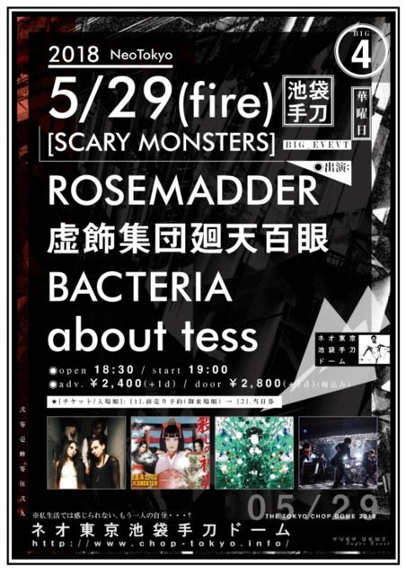 ¢¡2018/5/29(tue) ÃÓÂÞ¼êÅá [SCARY MONSTERS] ½Ð±é¡§ROSEMADDER / about tess / µõ¾þ½¸ÃIJöÅ·É´´ã / BACTERIA(5/25¸ø³«) ³«¾ì 18:30 / ³«±é 19:00 Á°Çä ¡ï2,400(+1d) / ÅöÆü ¡ï2,800(+1d) [¥Á¥±¥Ã¥È/Æþ¾ì½ç]: [1].Á°Çä¤êͽÌó(¸æÍè¾ì½ç) ¢ª [2].ÅöÆü·ô ²ñ¾ì¤Ï¤³¤Á¤é¢¢¢ http://www.chop-tokyo.info/access.html ͽÌó¤Ï¤³¤Á¤é¢¢¢ rosemadder2017@gmail.com ¤´Í½Ìó¤ÎºÝ¤Ï¡¢¥é¥¤¥Ö¤ÎÆüÄø¡¦¤ªÌ¾Á°(¤Õ¤ê¤¬¤Ê)¡¦Ëç¿ô¤ÎÌÀµ¤ò¤ª´ê¤¤¤¤¤¿¤·¤Þ¤¹¡£
