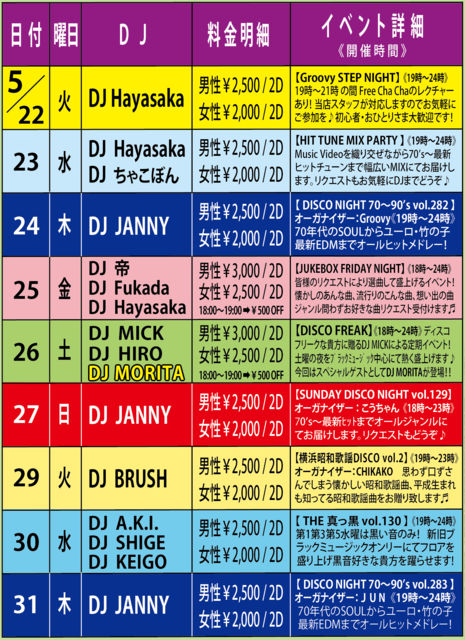 5·î¤âËè½µÌÚÍËÆü¤Ï¡ª ¤ª¤Ê¤¸¤ß¥æ¡¼¥í¥Ó¡¼¥È¿¤á¤Î¥Ç¥£¥¹¥³¥Ê¥¤¥È¢ö 70ǯÂå¤ÎSOUL¥ß¥å¡¼¥¸¥Ã¥¯¤«¤éºÇ¿·¤ÎEDM¤Þ¤Ç¥ª¡¼¥ë¥Ò¥Ã¥È¥á¥É¥ì¡¼¡ª Music Video¤ò¤Õ¤ó¤À¤ó¤Ë¿¥¤ê¸ò¤¼¤Ê¤¬¤éÍÙ¤ì¤ë¶ÊÀ¹¤êÂô»³¤Ç¤ªÂ£¤ê¤·¤Þ¤¹♬ ¡Ú¥ª¡¼¥¬¥Ê¥¤¥¶¡¼¡Û£Ê£Õ£Î ¡Ú£Ä£Ê¡ÛJANNY¡ÊMAHARAJA ROPPONGI¡Ë ¡Ú²»³Ú¡ÛALL GENRE ¡ÊSOUL¡¢Ãݤλҡ¢¥À¥ó¥¯¥é¡¢EURO¡¢HI-NRG¡¢TECHNO¡¢R&B¡¢EDM¡¢etc¡Ä¡Ë ¡Ú³«ºÅ»þ´Ö¡Û 19:00¡Á24:00 ¡ÚÎÁ¶â¡Û ÃËÀ¡§¡ï2,500 / 2Drinks ½÷À¡§¡ï2,000 / 2Drinks