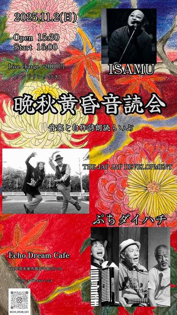 ´ôÉ츩ËÜÁã»Ô¤Ëºß¤ëÉÔÄêµÙ±Ä¶È(¥¤¥Ù¥ó¥È³«ºÅÆü¤Ë±Ä¶È)¤Î¥«¥Õ¥§¡Ö¥¨¥³¡¼¥É¥ê¡¼¥à¥«¥Õ¥§¡×¤Ë¤Æ³«ºÅ¤Î½©¤Î½ªÈפβ«ºª»þ¤Ë³«¤«¤ì¤ëÌû²÷¤Ê²»³Ú¤È¼«ºî»í¤ÎϯÆÉ¤Ë¤è¤ë±ãۥ饤¥Ö ▢11/2¡ÊÆü¡Ë ÂêÌÜ: ÈÕ½©²«ºª²»ÆÉ²ñ ¾ì½ê: ËÜÁã¡Ö¥¨¥³¡¼¥É¥ê¡¼¥à¥«¥Õ¥§¡× ½»½ê: ´ôÉ츩ËÜÁã»ÔÁ¾°æÃæÅç1170-16 ÅÅÏÃ: 0581-34-3915 ¸òÄÌ: ¡þŴƻ¡ÖËÜÁã¡×¤è¤êÅÌÊâÌó8ʬ¡£(640m) ¡þŴƻ¡Ö¿¥Éô¡×¤è¤êÅÌÊâÌó23ʬ¡£(1.8km) ¡þŴƻ¡Ö»å´Ó¡×¤è¤êÅÌÊâÌó28ʬ¡£(2.2km) »þ´Ö: 15»þȾ³«¾ì/16»þ³«±é ÎÁ¶â: 2000±ß(1dÉÕ) ½Ð±é: ◉ISAMU(»í¤ÎϯÆÉ/»íŪ