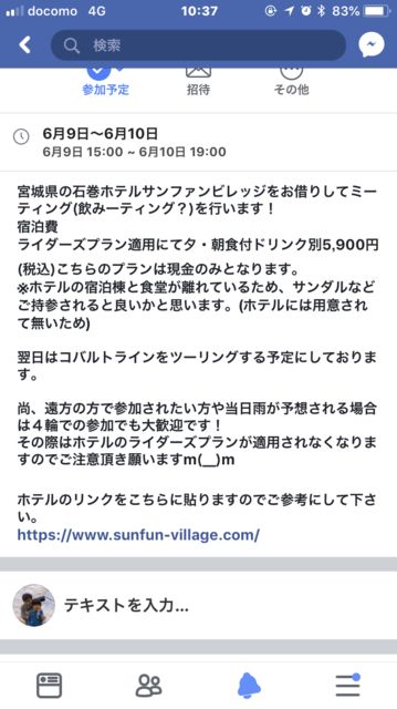 参加希望の方は「かっす」にメッセージください。 本当の主催者はMixiのアカウントないので、仲介いたします。 注意!:コバルトライン片側交互通行箇所多数のため、ツーリング プラン変更予定です。 また、大雨の場合はツーリングそのものは中止となります。 注意!: 宿に寝巻き、サンダルはありませんので、必要な方はご用意ください。夕食時の飲み物は売店購入orサーバービールの各自購入だそうです。 ↓はFacebookのイベントへのリンクですが、Facebookアカウントを持って、かつ、参加者から招待を受けないとひらけないようです。ご注意
