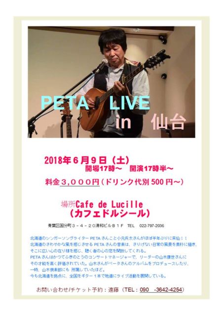 元ふきのとうコンサートマネジャー小元兵太さんの仙台ライブのご案内です。 小元兵太さんの仙台ライヴを、6月9日(土)17時半〜カフェドルーシールで開催いたします!!小元さんは北海道在住のシンガーソングライターで素朴なオリジナル曲やギターインストを聴かせてくれます。 またふきのとうの元コンサートマネージャーだった方なので、ふきのとうの名曲をさわやかな声でカヴァーしてくれます。 北海道から叙情派フォークコミュのとんぼさん、北九州から、Mumin Clubの(山木さん細坪さんのOAやってる)のりのりさんも駆けつけてくれます