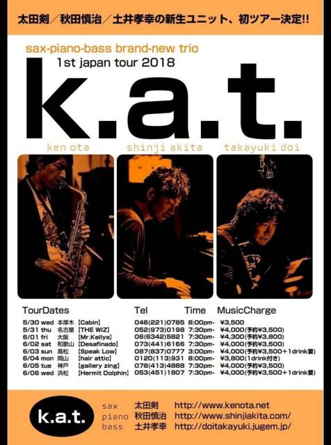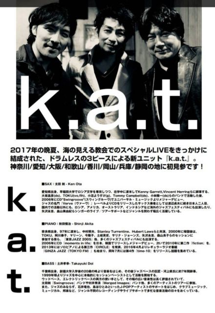 sax-piano-bass-brand-newtrio 1st jaoan tour 2018 k.a.t 和歌山公演のお知らせ 昨年たった一度のハプニング的なセッションで意気投合した3人があえてドラムレスで音と向き合う新感覚Jazz Unit、k. a. t. 。 3人の足し算だけでなく引き算さえも音楽に昇華させ、バランスと調和の美学を具現化する。 数々の関東圏でのライブを経て、全国8箇所を巡る初ツアー、必見必聴です!! k.a.t.
