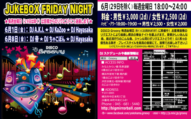 ¡ú¤ªµÒÍͤ«¤é¤Î¥ê¥¯¥¨¥¹¥È¤Ë¤ÆÁª¶Ê¤¹¤ë¥¤¥Ù¥ó¥È¡§JUKEBOX FRIDAY NIGHT¡ú Àβû¤«¤·¤¤¤¢¤ó¤Ê¶Ê¡¢ºÇ¶áή¹Ô¤ê¤Î¤³¤ó¤Ê¶Ê¡¢¥¸¥ã¥ó¥ëÌä¤ï¤º¥ê¥¯¥¨¥¹¥È¤ò¤É¤¦¤¾¡ª DJ¤½¤ì¤¾¤ì¤Î¥×¥ì¥¤¥¹¥¿¥¤¥ë¤ò³§ÍͤǤɤ¦¤¾¤ª³Ú¤·¤ß²¼¤µ¤¤♬ ¡Ú²»³Ú¡Û¥ª¡¼¥ë¥¸¥ã¥ó¥ë¡Ê¥ê¥¯¥¨¥¹¥ÈÍ¥Àè¡Ë Soul¡¢Funk¡¢Dance Classics¡¢HipHop¡¢R¡õB¡¢EDM¡¢Euro¡¢etc... ¡Ú³«ºÅ»þ´Ö¡Û 18¡§00¡Á24¡§00 ¡Ú¥Ï¥Ã¥Ô¡¼¥¢¥ï¡¼ÎÁ¶â / 18:00¡Á19:00¤Ë¤´ÍèŹ¤ÎÊý¡Û ÃËÀ¡§¡ï2,500 / 2Drinks ½÷À¡§¡ï2,000 / 2Drinks ¡ÚÎÁ¶â / 19:00°Ê¹ß¤´ÍèŹ¤ÎÊý¡Û ÃËÀ¡§¡ï3,000 / 2Drinks ½÷