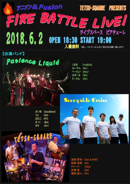 ·Ú²»£Ï£Ç¥«¥ï¥Ð¥¿¡¡Fusion¥é¥¤¥Ö¡ª Æü»þ¡¡¡§¡¡6/2(ÅÚ)¡¡³«±é¡¡19:00¡Ê³«¾ì¡¡18¡§30¡Ë Sunnyside Cruise ½Ð±éͽÄê»þ´Ö¡¡20:00 ²ñ¾ì¡¡¡§¡¡¥é¥¤¥Ö¥¹¥Ú¡¼¥¹¥Ô¥¢¥Á¥§¡¼¥ì¡Ê̾¸Å²°»Ô̾Åì¶èËҤθ¶3-1002¡Ë ¡¡¡¡¡¡¡¡ http://www.piacere-live.com/ ¼çºÅ¡¡¡§¡¡TETSU-SQAURE ½Ð±é½ç¡§Patience Liquid¡Ê¥¢¥Ë¥½¥ó¡Ë / Sunnyside Cruise¡ÊFusion¡Ë / TETSU-SQAURE¡ÊFusion¡Ë ÎÁ¶â¡¡¡§¡¡£±¥ª¡¼¥À¡¼É¬¿Ü¡Ê¥ß¥å¡¼¥¸¥Ã¥¯¥Á¥ã¡¼¥¸ÌµÎÁ¡Ë Ãó¼Ö¾ì¡§¡¡¤ªÅ¹¤ÎÁ°4¡Á5ÂæµÚ¤Ó¼þÊÕ¥³¥¤¥ó£Ð