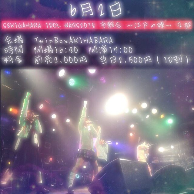 ¡ÖSEKIGAHARA IDOL WARS2018 ͽÀï²ñ¡Á¹¾¸Í¤Î¿Ø¡Á¡×£²Éô Æü»þ¡§06/02(ÅÚ) ³«¾ì16:30 / ³«±é17:00 ²ñ¾ì¡§TwinBoxAKIHABARA ÎÁ¶â¡§Á°Çä2,000±ß / ÅöÆü2,500±ß (1DÊÌ) ¢¨ºÆÆþ¾ì²Ä ½Ð±é¡§¿À»È¹ì¤¯¡¢·ã¾ð¤ÎÇ¡¤¯¡£¡¿¤µ¤è¤Ê¤é¡¢¥·¥Ã¥¯¥¹¥Æ¥£¡¼¥ó¡¿¤Ï¤Ã¤Ô¤Ã¤Ô¡¿Êü¥×¥ê¥æ¡¼¥¹¡¿ÀûΧ¥Õ¥ê¡¼¥¸¥¢¡¿Êк¹ÃÍ¥¹¥¿¥ó¥À¡¼¥É¡¿²Ì½Á100%¡¿°Ëã¤Ã̼¡¿°Û¹ñ¤Î¥Ñ¥ë¥Ô¥¿¥ó¥Æ¡¿ÈÑǺParadox¡¿SparklePinkRuby¡¿Premony¡¿¥¸¥¥ë¡õ¥Ï¥¤¥É
