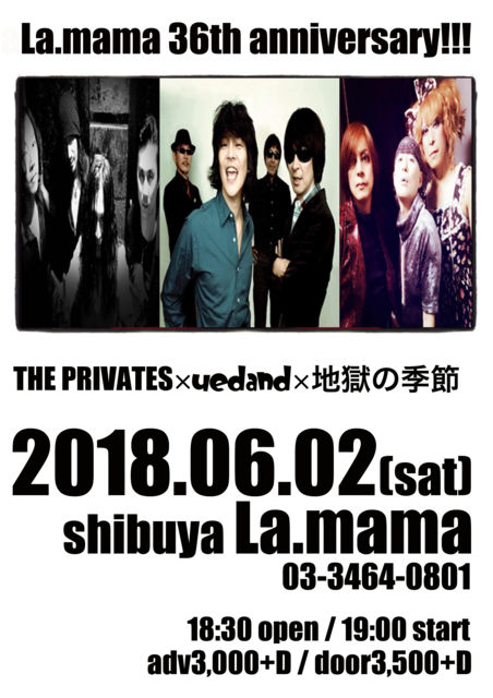 2018.06.02(sat) shibuya La.mama 03-3464-0801 La.mama 36th anniversary ¡ØTHE PRIVATES ¡ß uedand ¡ß ÃϹö¤Îµ¨Àá¡Ù THE PRIVATES / uedand / ÃϹö¤Îµ¨Àá 18:30open / 19:00start adv3,000¡ÜD / door3,500¡ÜD ½ª±é¸å¡¢after party¤¢¤ê(Í×ͽÌó¡§²ñÈñ2,000±ß¥Ä¥Þ¥ßÉդͽ»»ÆâÆÝ¤ßÊüÂꡢͽ»»½ªÎ»¸å¥¥ã¥Ã¥·¥å¥ª¥ó¡Á4:00L.O.4:30CLOSE) ÂǤÁ¾å¤²»²²Ã¤´Í½Ìó¤Ï¤³¤Á¤é¤Ø¤Î¥ê¥×¥é¥¤¤«¡¢ ·ï̾¤Ë£¶¡¿£²afterparty»²²Ã¡¢¤ªÌ¾Á°¡¢»²²Ã¿Í¿ô¤ò¤ª½ñ¤¤Î¾å¡¢ glitterflicker@yahoo.co.jp¤Þ¤ÇÁ÷¿®²¼¤µ¤¤¡£ ³§¤µ¤Þ¤Î¤´»²²Ã¤ò¤ªÂÔ¤Á¤·¤Æ¤ª¤ê¤Þ¤¹¡£