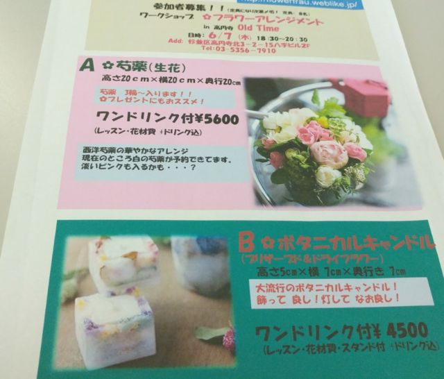 バーで開催する 1ドリンク(アルコール可)付きのフラワーアレンジメントレッスン。 A生花(芍薬)と Bプリザーブドフラワーで作るボタニカルキャンドル どちらか選べます。 https://s.tabelog.com/tokyo/A1319/A131904/13206194/top_amp/
