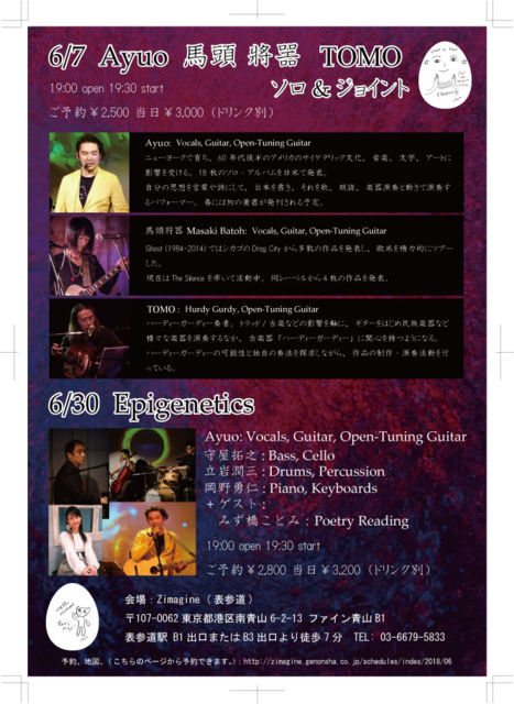 6月7日はオープン・チューニング・ギター3本とハーディー・ガーディーという中世ヨーロッパの楽器を含むサイケデリック・フォークと中世ヨーロッパに基づくトラッドが中心になるコンサートになります。 馬頭将器さんは20歳の時に英国の伝統的な弾き語りをしているマーティン・カーシー(MBE 大英帝国勲章ナイト・グランドクロス星章)のところに行って、彼が弾いているいろいろな曲でのチューニングと弾き方を学んだそうです。そして、来月にはぺンタングルの伝説的なオープン・チューニング・ギターの演奏者、ジョン・レンバーンの日本でのライブを