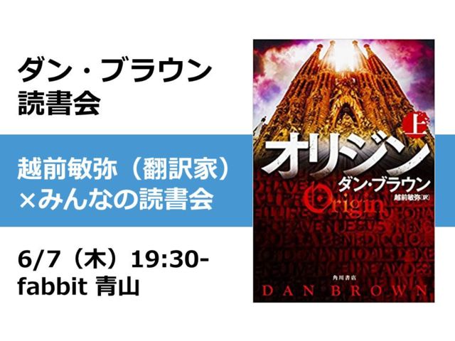 『ダ・ヴィンチ・コード』を超える一気読み本と話題の ロバート・ラングドンシリーズ最新作『オリジン』。 今夜の「みんなの読書会」は、このベストセラーを題材に 心ゆくまで語るイベントです。 イベントでは、ダン・ブラウン作品の翻訳を手掛ける越前敏弥さんを スペシャルゲストに刊行記念トークも実施します。 本作のキーワードは 「人工知能」 「スペイン」 「我々はどこから来たのか、どこへ行くのか」 気になった方は書店さんで本書を手に取ってみてください! 【こんな人におすすめです。】 ・読書好きの仲間を増やし