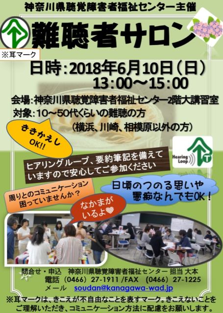 毎年恒例の難聴者サロンが今年度も開催します。 初めての方、ぜひご参加ください。 日時:2018年6月10日(日)13時〜15時まで 会場:神奈川県聴覚障害者福祉センター 2階大講習室 対象:10~50代くらいの難聴の方 神奈川県在住 (横浜、川崎、相模原市以外の方) 職場で、会議でみんなどうしてる? ママ友とお話ししたいのに聞き取れなくて、、、 朝、目覚まし時計が、使えなくて、、、みんなどんな工夫してるの? 健聴者の中に入っていけない。何の話?なんて言ったの? 玄関のピンポンにきづけないし、話せない。 家族との