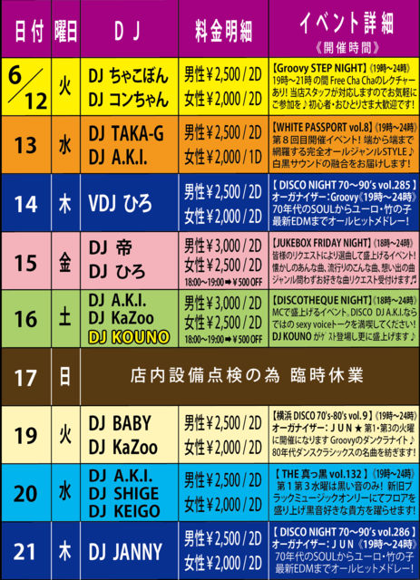6月も第2&第4火曜日は!【Groovy STEP NIGHT】19時〜21時位の間、簡単なフリーチャチャステップのレクチャーあります! 初心者の方、お一人様でも、当店スタッフがご対応させて頂きますのでどうぞお気軽にご参加ください♪ 【DJ's】 ちゃこぼん / コンちゃん 【動画】 http://youtu.be/TJumPL0WciA http://youtu.be/jfhrY1yxn-A http://youtu.be/xJEb3mrihDc 【音楽】ALL MIX (21時位からは通常のDISCO TIMEになります。リクエストにも出来る限りお応えいたしますのでDJまでお気軽にどうぞ♪) 【開催時間】 19:00〜24:00 【