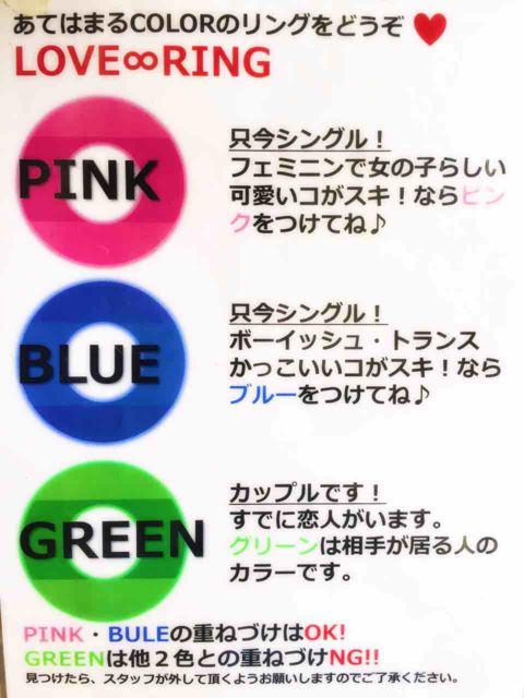★6/13(水)★ 平日 友達・恋人作ろうparty♪ Candy Strap→名古屋市中区栄5-6-4栄能楽ビル3F (052)228-8678 料金→1500円(1D+おつまみ付) 追加ドリンク500円〜 カラオケ一曲200円 予約なしで誰でも参加OK! ★20時〜22時半まで シングルONLYで開催! ステキな出会いがあるかも(^^) ★22時半〜2時?(盛り上がり次第朝まで) 誰でも参加OK! カップル友達や趣味友達・飲み友達を増やそ(^^) ラブトラのラブリングシステムあります☆ ◇ピンク→フェミニンな女性が好きな方 ◇ブルー→中性・ボーイッシュな女性が好きな方 ◇グリーン→カップルの方で