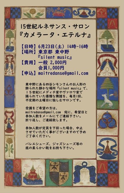 15世紀ルネサンスサロン『カメラータ・エテルナ』は、四谷シモンさんのお人形のある東中野の静かな場所『silent music』で、15世紀にメディチ家やエステ家で踊られていた優雅な舞踏を、毎月1回、愉しむサロンです。 受講をご希望の方は、 maitredanse@gmail.com 宛、もしくはメッセージでご連絡を下さい。 メールが苦手な方は、お名前とお電話番号をお送りください。こちらの電話番号をメールでお伝えした上で、電話にてご連絡差し上げます。 参加人数が定員を上回った場合、お断りさせていただく事がございます。また、参加人数が定員を下回った場