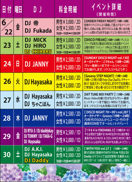 6月も第2&第4火曜日は!【Groovy STEP NIGHT】19時〜21時位の間、簡単なフリーチャチャステップのレクチャーあります! 初心者の方、お一人様でも、当店スタッフがご対応させて頂きますのでどうぞお気軽にご参加ください♪ 【動画】 http://youtu.be/TJumPL0WciA http://youtu.be/jfhrY1yxn-A http://youtu.be/xJEb3mrihDc 【音楽】ALL MIX (21時位からは通常のDISCO TIMEになります。リクエストにも出来る限りお応えいたしますのでDJまでお気軽にどうぞ♪) 【開催時間】 19:00〜24:00 【料金】 男性:¥2,500 / 2Drinks 女