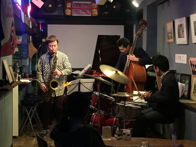 森近徹(ts)さん、田村和大(p)さん、佐久間高広(b)さん、田村陽介(ds)さんのカルテットです。 森近さんは、フュージョン色の強いオリジナル曲に定評があります。森近さんのアルバム「Another World」を聴いていると、どっぶり森近ワールドに浸ってしまいます。 ピアノの田村和大さんは、ロックにハマった10代、ブラックミュージックをたどって、ジャズにたどり着き、演奏活動を始めたそうです。ジャンルを超えたミュージシャンと共演を重ねています。 佐久間さんは、ファンキーなベーシスト。心に響くベースラインです。 ドラムの