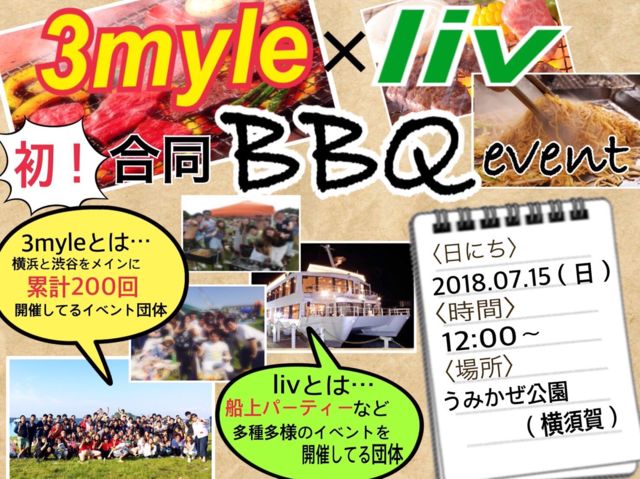 毎月恒例となりました3myle大規模交流会(飲み会)ですが、今回は初のや合同BBQイベントが決定しました 累計約200回イベントを開催している“イベント団体3myle”と、船上パーティーなど多種多彩なイベントを開催している“イベント団体liv”の初の合同大BBQイベント 複数人参加、1人参加大歓迎です この夏、BBQイベントで最高の思い出を作りましょう