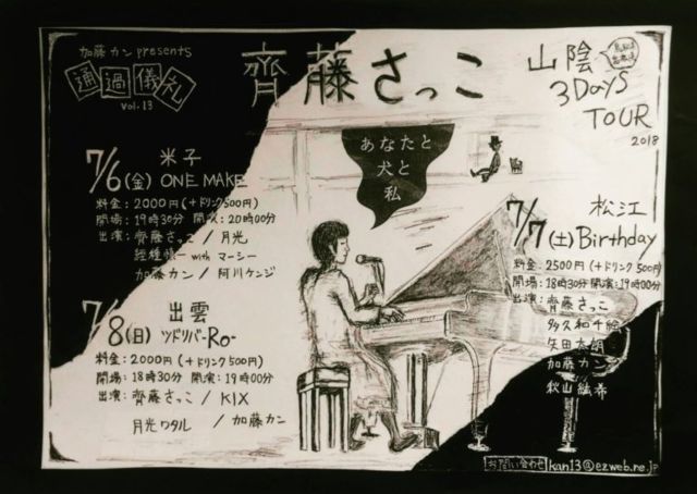 7/7(sat)@MUSIC BAR Birthday 加藤カンpresents「通過儀礼」 <CAST> 秋山紘希 加藤カン 斎藤さっこ 矢田太朗 多久和千絵 O/S 18:30/19:00 チケット 2500yen(要drink代別500yen必要) 秋山紘希はトップバッターで19:00からの出演予定! 35分ステージです チケット予約は、メール件名に「チケット予約」、本文に「公演日・カタカナフルネーム・枚数」を明記の上、hommehomme777@gmail.comまで。