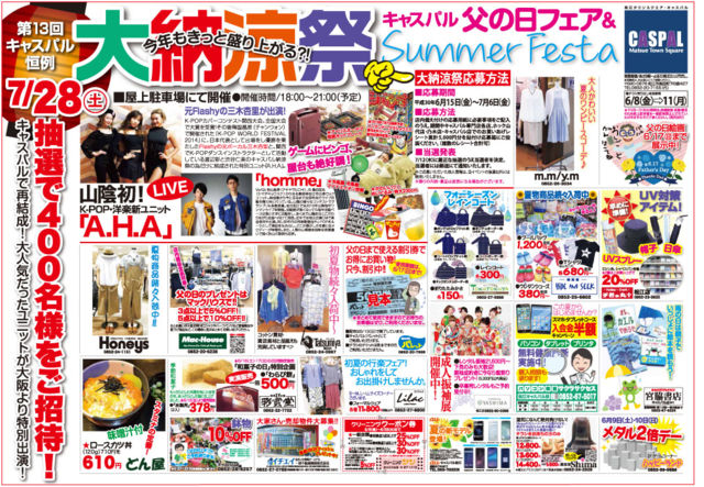 7/28(sat) 松江キャスパル屋上駐車場 キャスパル大納涼祭 <LIVE出演> homme A.H.A ※その他様々な催しあり 時間:18:00〜21:00(予定) ご注意:本公演は抽選で選ばれた方しかご入場いただけません。 <大納涼祭応募方法> 応募期間:6/15(金)〜7/6(金) 応募方法:店内備え付けの応募用紙に必要事項を明記の上、期間中キャスパル専門店各店・ホック山代店・乃木店・キャスパル店でのお買い上げレシート累計5000円分を貼り付け応募箱にご投函ください(複数のレシート合計可能) 当選発表:7/12(木)に厳正な抽選の上、当選者を決定。当選者