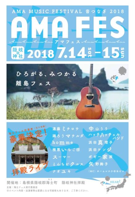 2018/7/14&15 隠岐神社 AMA FES 2018 <CAST> homme 遠藤ミチロウ 踊ろうマチルダ 極悪いちご団 スーマー とんちピクルス ナオユキ 中山うり ハッチハッチェルバンド 浜田真理子 浜田ケンジ ボギー家族 矢野絢子 (MC) ホームレス小谷&ピコ 開演11:00〜 入場無料 hommeは14日の15:00からの出演予定です 以下、homme HPより。 ・・・・・ 島根県隠岐郡海士町にある隠岐神社て2日間開催されるフェス「アマフェス2018」に出演します。 hommeは14日に出演で、デュオ形式です。 本イベントに関わる様々な人の色々な想いが凝縮されたこのフェス
