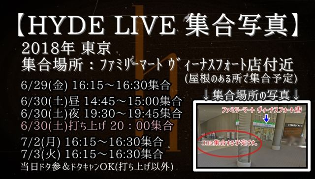 ¡ü´ë²èÆâÍÆ HYDE LIVE 2018Åìµþ¸ø±é¤Î¥é¥¤¥ÖÅöÆü¤Ë½¸¹ç¼Ì¿¿(SNSÅê¹ÆOK)¤ò»£¤ê¡¢¸åÆü¼Ì¿¿¤òÁ÷¤ë´ë²è¤ò³«ºÅÃפ·¤Þ¤¹¡£ ¥é¥¤¥ÖÅöÆü¤Ï¹²¤·¤¯¤Ê¤ê¸ÄÊ̤Çͧ¿Í¡¢¥Õ¥©¥í¥ï¡¼¤ä¥Þ¥¤¥ß¥¯¤ÈÂÔ¤Á¹ç¤ï¤»¡¢¤ª²ñ¤¤¤¹¤ë¤Î¤ÏÂçÊѤÀ¤È»×¤¦¤Î¤Ç¡¢¤³¤Îµ¡²ñ¤ò¤´³èÍѲ¼¤µ¤¤¡£ ¥é¥¤¥Ö¤Î»×¤¤½Ð¤ä¿·¤¿¤Ê·Ò¤¬¤ê¤òºî¤ë¾ì¤Ë¤Ê¤ì¤Ð¹¬¤¤¤Ç¤¹¡£ ¢£¢£¢£¢£¢£¢£¢£¢£¢£¢£¢£¢£¢£¢£ ¡ü½¸¹ç Æü»þ ¡6/29(¶â) 16¡§15¡Á16¡§30½¸¹ç ¢6/30(ÅÚ)Ãë 14¡§45¡Á15¡§00½¸¹ç £6/30(ÅÚ)Ìë 19¡§30¡Á19¡§45½¸¹ç ¤6/30(ÅÚ)ÂǤÁ¾å¤² 20¡§00½¸¹ç¡Á22¡§30½ªÎ» ¥7/2(·î) 16¡§15¡Á16¡§30½¸