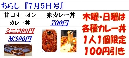☆5日木曜日、 ◎丼飯は、 ⑴甘口オニオンカレー丼(ミニ:200円/M:300円) ⑵マンゴカレー丼(1000円) ⑶赤カレー丼(700円) * * * * ☆毎週木曜・日曜日は、各種カレー丼が、お1人様1個限定で100円引き〜(・◇・)/
