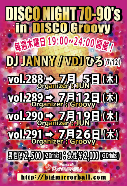 7月も毎週木曜日は! おなじみユーロビート多めのディスコナイト♪ 70年代のSOULミュージックから最新のEDMまでオールヒットメドレー! Music Videoをふんだんに織り交ぜながら踊れる曲盛り沢山でお贈りします♬ 【オーガナイザー】JUN 【DJ】JANNY(MAHARAJA ROPPONGI) 【音楽】ALL GENRE (SOUL、竹の子、ダンクラ、EURO、HI-NRG、TECHNO、R&B、EDM、etc…) 【開催時間】 19:00〜24:00 【料金】 男性:¥2,500 / 2Drinks 女性:¥2,000 / 2Drinks