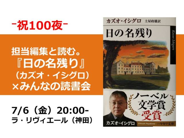 4ǯ´Ö³¤±¤Æ¤¤¿ÆÉ½ñ²ñ¤â¤Ä¤¤¤Ë100²óÌÜ¡£ µÇ°¤ÎÌë¤Ï¡¢¥Î¡¼¥Ù¥ëºî²È¤Î¥«¥º¥ª¡¦¥¤¥·¥°¥í¤µ¤ó¤ÎÂåɽºî¡ØÆü¤Î̾»Ä¤ê¡Ù¤Ç½Ë¤·¤Þ¤¹¡£ ¥«¥º¥ª¡¦¥¤¥·¥°¥í¤µ¤ó¤Ï¡ØÌëÁ۶ʽ¸¡Ù¡Ø¤ï¤¿¤·¤òÎ¥¤µ¤Ê¤¤¤Ç¡Ù¤ò ²ÝÂêËܤǼè¤ê¾å¤²¤¿¤ß¤ó¤Ê¤ÎÆÉ½ñ²ñ¤Ë¤È¤Ã¤Æ¤âÁÛ¤¤¤Î¤¢¤ëºî²È¤Ç¤¹¡£ ²ñ¾ì¤Ï¡¢ÁáÀî½ñ˼Ãϲ¼1³¬¥Õ¥ì¥ó¥Á¥ì¥¹¥È¥é¥ó¡Ö¥é¡¦¥ê¥ô¥£¥¨¡¼¥ë¡×¤òÂßÀÚ¡ª ¤Þ¤¿¡¢º£Ìë¤âÁáÀî½ñ˼¤ÎôÅöÊÔ½¸¼Ô¡Ê»³¸ý¾½¤µ¤ó¡Ë¤ò¥²¥¹¥È½Ð±é¤¤¤¿¤À¤¤Þ¤¹¡£ ¥«¥º¥ª¡¦¥¤¥·¥°¥í¤µ¤ó¤âˬ¤ì¤¿¤³¤È¤¬¤¢¤ë¥ì¥¹¥È¥é¥ó¤Ç¤¹¡£ ¥¤¥·¥°¥íºîÉʤ⡢ʷ°Ïµ¤¤â¡¢Â¸Ê¬¤Ë¤´´®Ç½¤¯¤À¤µ¤¤¡ª ¡Ú¤³¤ó