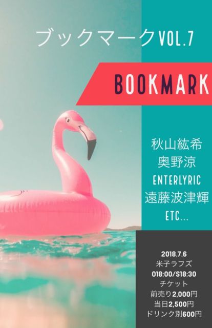 7/6(fri) 米子laughs 遠藤波津輝pre 「ブックマーク vol.7」 <CAST> 秋山紘希 遠藤波津輝 奥野涼 ENTERLYRIC and more… O/S 18:00/18:30 A/D 2000yen/2500yen(要drink代別) ソロライブ、トリで20:50からの出演予定です