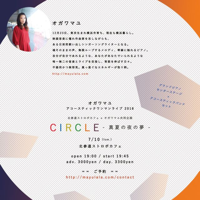 thank you!SOLD OUT! 2018/7/10(TUE) オガワマユ@北参道ストロボカフェ 北参道ストロボカフェxオガワマユ共同企画 オガワマユ アコースティックワンマンライブ2018 “CIRCLE〜真夏の夜の夢〜” ■open 19:00/start 19:45 ■チャージ3000/3300yen(前/当)+1Drink別 http://www.strobe-cafe.com/kitasando/schedule/2018/07/201807101.html *グランドピアノセンターステージ x アコースティックスペシャルバンド編成でお送りします、特別な夜を。