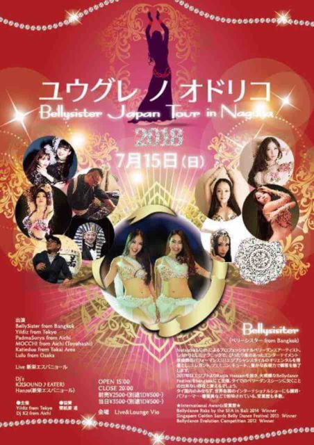 7月15日(日) BellySister Japan Tour 名古屋公演 〜ユウグレ ノ オドリコ〜 ●会場 Live&Lounge Vio http://www.liveandloungevio.com/ 開演 15時〜20時 ●料金 前売 ¥2500-(別途1D¥500-) 当日 ¥3500-(別途1D¥500-) 中学生以下小学生以上はチケット無料 別途1D¥500- 幼児完全無料 ●出演 ・BellySister from Bangkok ・Yildiz from Tokyo ・PadmaSurya from Aichi ・MOCCHI from Aichi(Toyohashi) ・Katieduo from Tokai Area ・Lulu from Oska ●Live ・新栄エスパニョール ●Dj's ・K2(SOUND♪EATER)