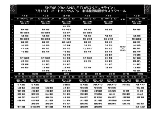 ³§¤µ¤Þ¡¢Æü¤´¤í¤è¤ê·§ºêÀ²¹á¤µ¤ó¤Ø¤Î±þ±ç¤¢¤ê¤¬¤È¤¦¤´¤¶¤¤¤Þ¤¹¡£ 7·î16Æü(·î½Ë)¤Ë³«ºÅ¤µ¤ì¤Þ¤¹ SKE48 22th ¥·¥ó¥°¥ë¡Ö¤¤¤¤Ê¤ê¥Ñ¥ó¥Á¥é¥¤¥ó¡× ·à¾ìÈ× È¯ÇäµÇ°Âç°®¼ê²ñ ¡÷¥Ý¡¼¥È¥á¥Ã¥»¤Ê¤´¤ä¤Ë¤ª¤¤¤Æ ·§ºêÀ²¹á¤µ¤ó¤Î¥Õ¥¡¥ó¥ß¡¼¥Æ¥£¥ó¥°¤ò¹Ô¤¤¤Þ¤¹¡£ =============================== ¢£³«ºÅ»þ´Ö¡§18»þ10ʬ¡ÊͽÄê¡Ë ¤¯¤Þ¤Á¤ã¤ó¤¬»²²Ã¤¹¤ë°®¼ê²ñ¤ÎÉô¤Ï ¡¦A1Éô¡¦¡¦¡¦¡¦11¡§00~12¡§30¡Ê12¡§10¼õÉÕ½ªÎ»¡Ë ¡¦A2Éô¡¦¡¦¡¦¡¦12¡§30~14¡§00¡Ê14¡§10¼õÉÕ½ªÎ»¡Ë ¡¦A3Éô¡¦¡¦¡¦¡¦15¡§10~16¡§40¡Ê16¡§20¼õÉÕ½ªÎ»¡Ë ¡¦A4Éô¡¦¡¦¡¦¡¦16¡§40~18¡§10¡Ê17